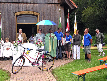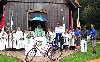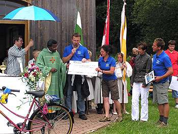Um in seiner Heimat Kamerun mobil zu sein und dort alle seine Projekte zu betreuen, bekam der Seelsorger, passend zu den sportlichen Aktivitäten des Vereins, zu der Spende noch ein Fahrrad als Geschenk. Seine Freude und Dankbarkeit konnten die Kirchenbesucher und der Vorstand des RMV Poppenhausen spüren und sehen. Die prompte Einladung nach Kamerun wertete der Verein aus Poppenhausen als "Ausdruck seines Engagements und des Stolzes" über das bereits Erreichte für die Kinder und Jugendlichen in der Heimat von Pfarrer Mvomo. Ob dieser Besuch einmal Realität werde, habe der Vorstand des RMV spontan aber nicht zusagen können.